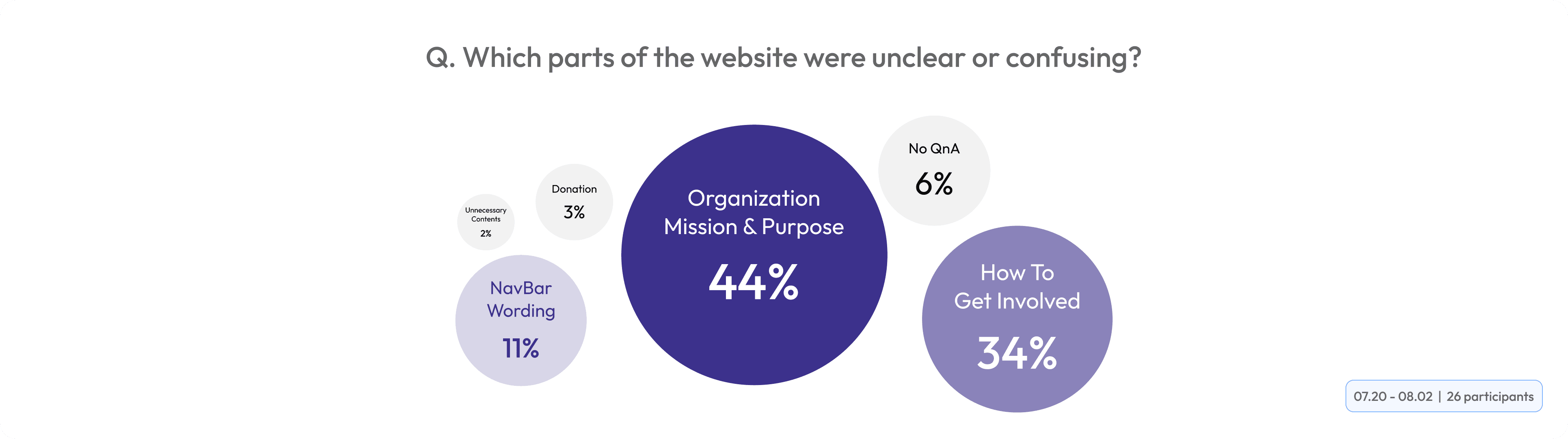 I started by experiencing the existing site as a first-time visitor — the most honest user test available. Even after multiple sessions, two questions went unanswered: "What does this organization do?" and "How do I get involved?" These weren't edge cases. They were the critical questions every new visitor would arrive with.