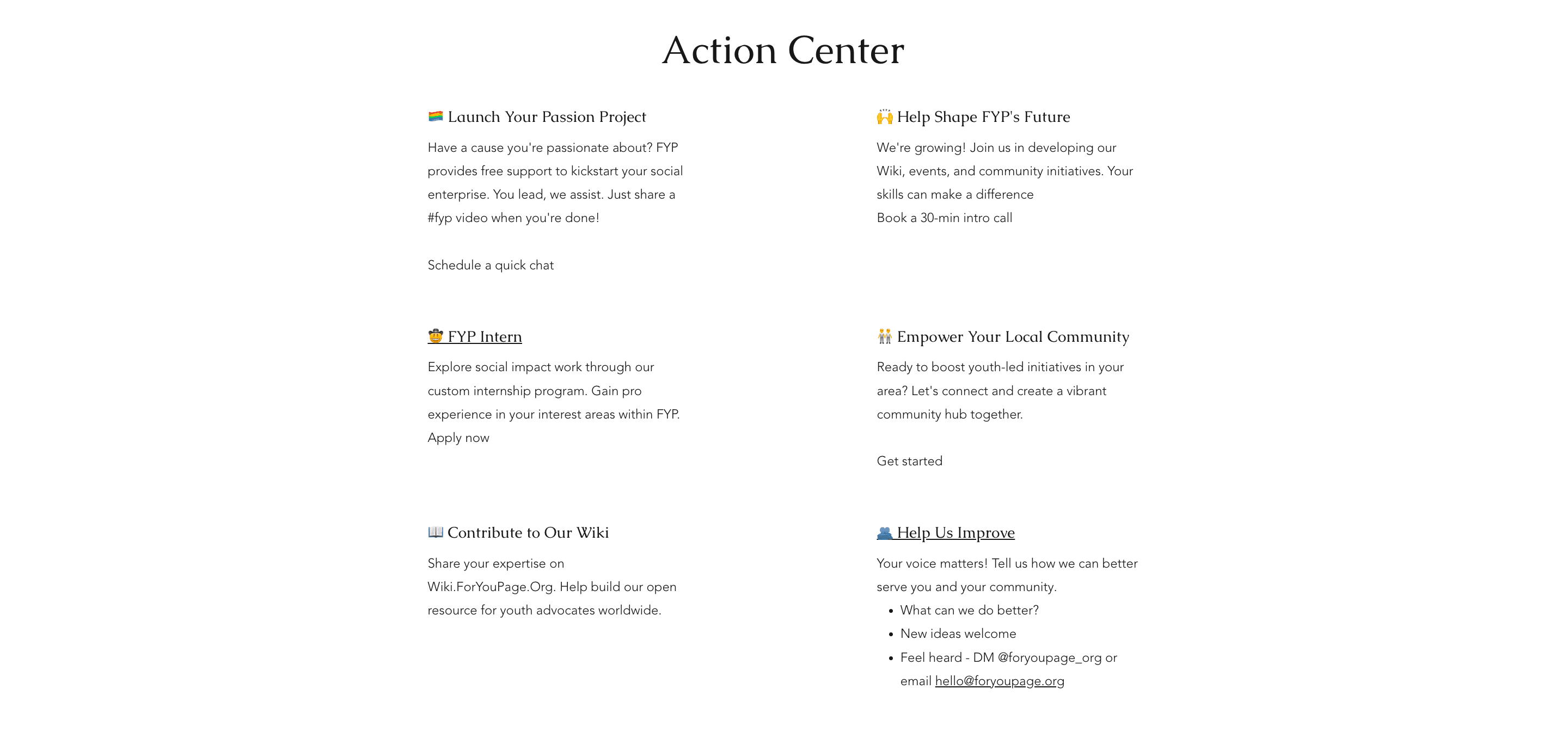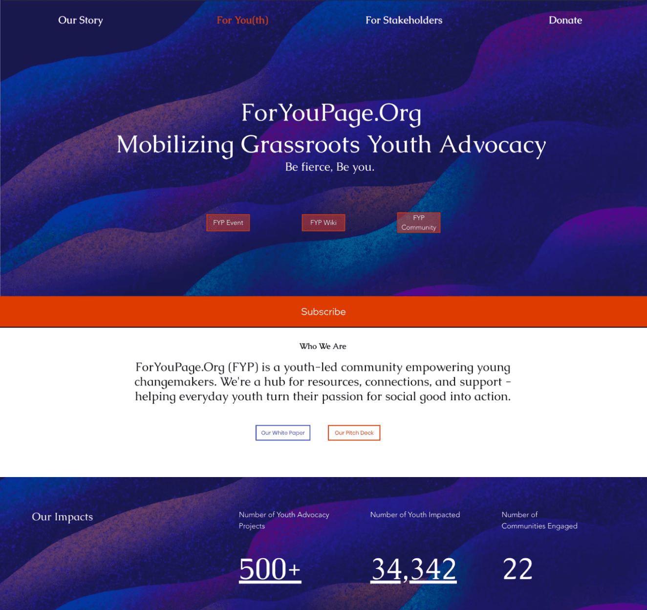 ForYouPage (FYP) is a youth-led nonprofit that helps young people launch social impact projects across mental health, sustainability, and civic engagement. When I joined as their first-ever design intern, the organization had no existing UX guidelines, no analytics tooling, and no formal design workflow.