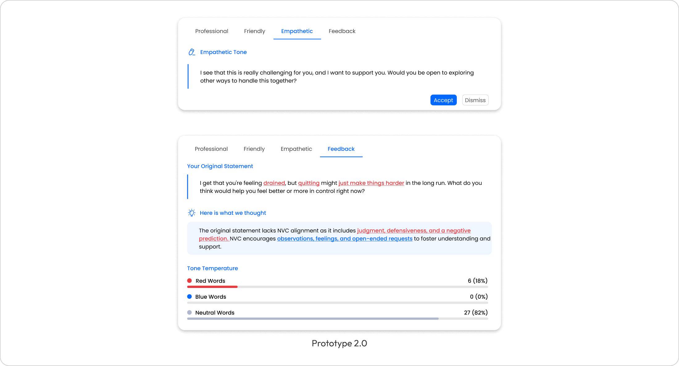 We grappled with how to best operationalize these principles - while maintaining alignment with NVC philosophy - into a scalable just-in-time intervention users could access during online discussion. Authenticity, user control, and trust were defined as constraints. Each of these themes were represented throughout our interface directions: we eliminated judgmental language and moved towards language that would allow learners to reflect for themselves through clear explanations and the ability to adjust the voice tone to maintain control of what they shared online (rather than feeling “spoken for” by the system).