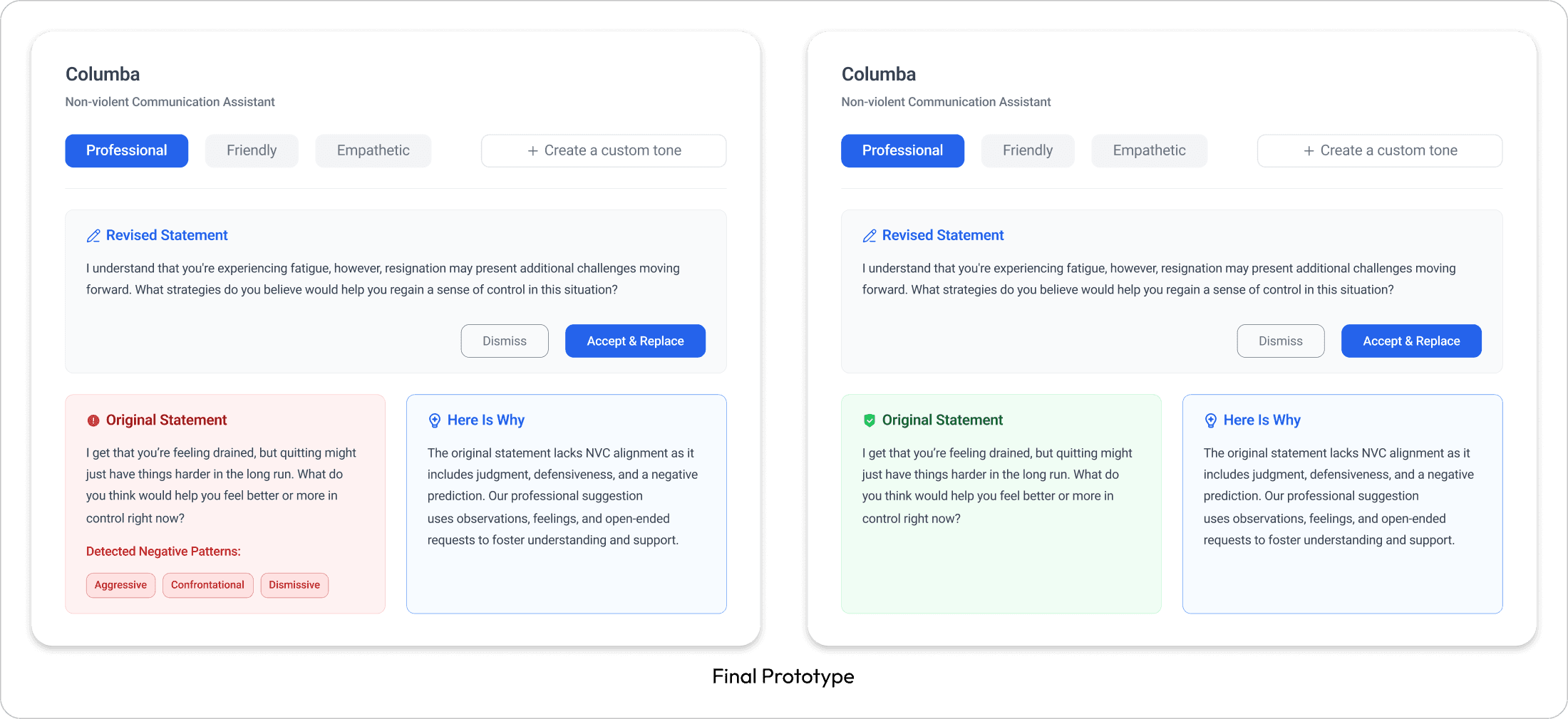 When text passes NVC guidelines, the UI stays familiar but adds a gentle note: "Your response aligns with NVC principles. Switch tones or reflect further if desired." Users retain full control with optional tone adjustments.